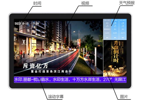 視頻、圖片、文本(滾動字幕)等多媒體文件上傳至服務器,制定各種多媒體組合播放內容, 下發給各顯示終端,可設定循環、定時、定次、插播、墊片、流媒體直播等播放方式。